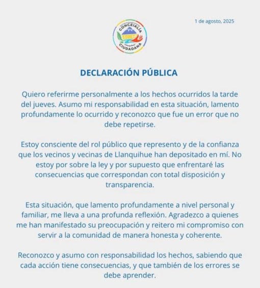 En el comunicado, Olavarría asumió su responsabilidad en el incidente, al expresar que “fue un error que no debe repetirse”. Asimismo, reconoció la confianza que los vecinos y vecinas de Llanquihue han depositado en su labor como autoridad comunal, indicando que enfrentará las consecuencias “con total disposición y transparencia”.