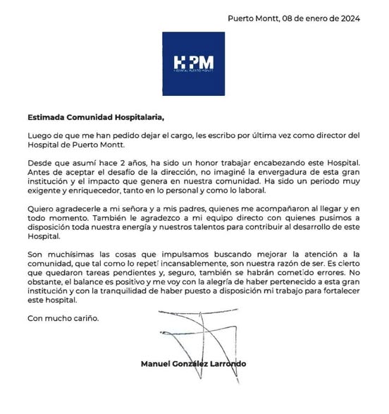 Con fecha 8 de enero de 2025 la Dirección del Servicio de Salud Del Reloncaví le solicitó la renuncia al director del Hospital Puerto Montt, Manuel González Larrondo, en medio de una serie de cuestionamientos por violencia sexual hacia funcionarios y pacientes, listas de espera y otros.