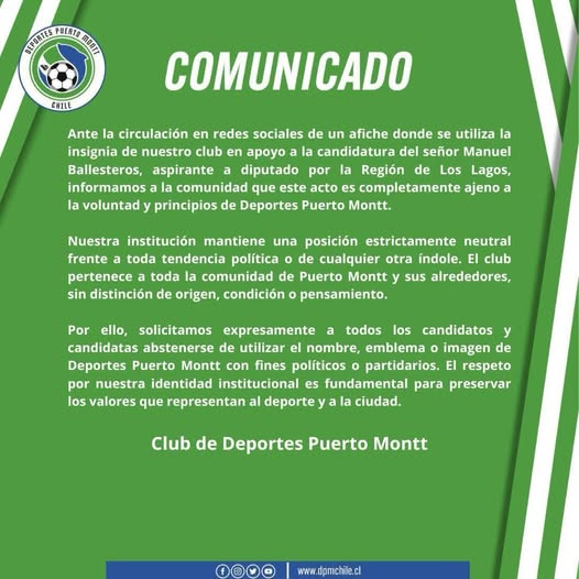 El Club de Deportes Puerto Montt emitió un comunicado oficial, en el que rechazó categóricamente el uso de su nombre, escudo e imagen institucional en propaganda política.