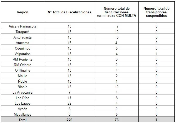Las regiones con más multas fueron Tarapacá (10), Biobío (10) y Los Ríos (8). Solo suspendieron tripulantes Antofagasta (6) y Valparaíso (1).