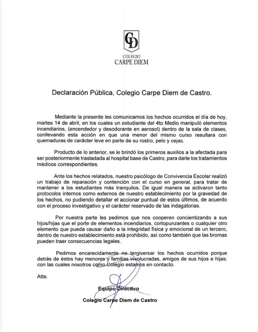 En paralelo, la dirección del Colegio Carpe Diem se refirió al delicado incidente, condenando el ataque junto con brindar la contención a la comunidad educativa, sin entregar mayores detalles por la naturaleza reservada de la investigación.