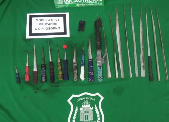 En Osorno, el procedimiento se llevó a cabo en el módulo 3 de imputados reincidentes, que alberga a 63 personas en prisión preventiva, donde se decomisaron 20 armas blancas y un teléfono.