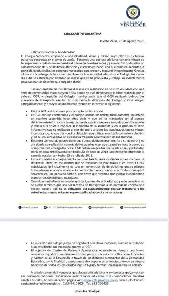 Por su parte, desde el Colegio Vencedor emitieron un comunicado en las últimas horas, en el que aseguraron que cuentan “con solo tres buses subsidiados, y para no hacer la diferencia entre los estudiantes que se trasladan en esos buses y los otros 11 no subsidiados (principalmente para no caer en vulneración de derechos), es que se plantea la idea de que el aporte es absolutamente voluntario y que va a un fondo común para solventar en una pequeña parte el alto costo que significa transportar diariamente a estudiantes de distintas localidades”, y descartaron que se niegue la matrícula a quienes no pagan la cuota.
