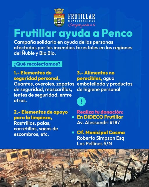 La comuna de Frutillar inició una campaña solidaria para ir en ayuda de las familias damnificadas por los incendios forestales que afectan a distintas zonas de las regiones de Ñuble y Biobío, especialmente a la comuna de Penco.
