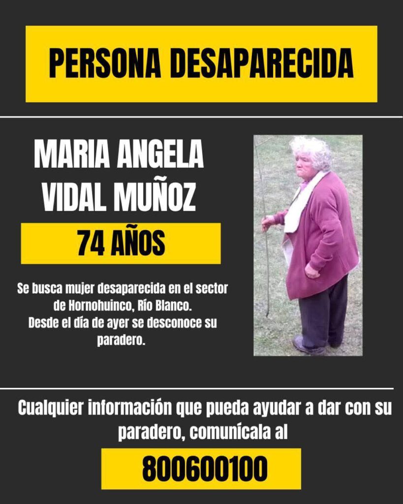 Sin resultados continúa la búsqueda de una adulta mayor, identificada como María Ángela Vidal Muñoz, de 74 años, quien desde el jueves pasado desapareció en el sector de Hornohuinco, Río Blanco, Correntoso comuna de Puerto Montt.