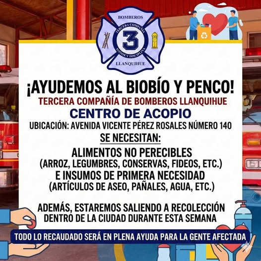 La Tercera Compañía de Bomberos de Llanquihue habilitó un centro de acopio solidario para ir en ayuda de las personas afectadas por los incendios forestales registrados en la Región del Biobío, particularmente en la comuna de Penco.